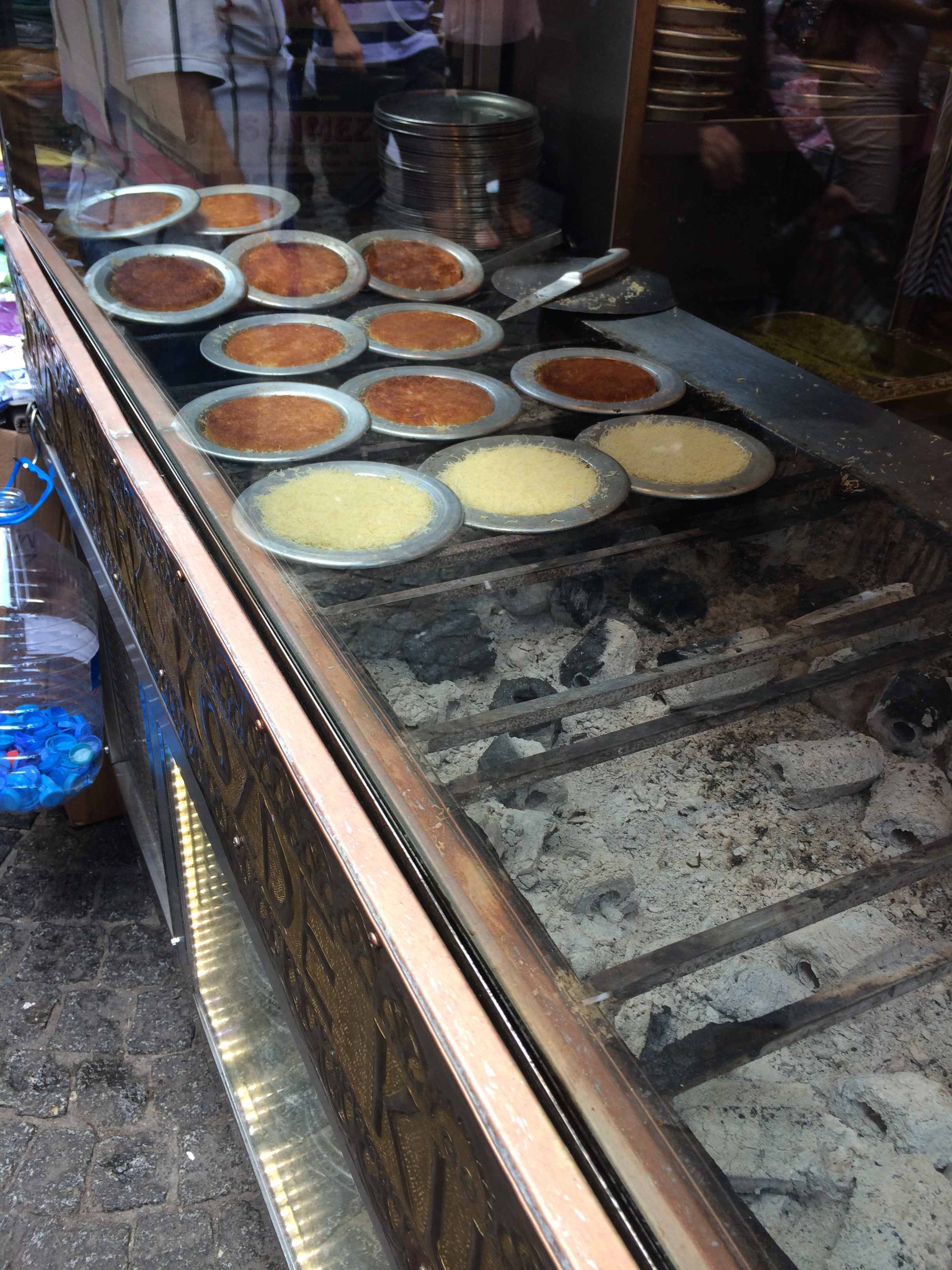 It’s a syrup soaked, cheese based, buttery, shredded pastry topped with pistachios. (soaked may not be the best word as it wasn’t too sweet, in fact it was just right, the perfect balance… but it’s Tuesday night, and I feel like it should be Friday after a crazy busy couple of days at work AND now I’ve got serious cravings!) The whole lot is toasted so it was nice and warm and the cheese was lovely and melted. I think it may have been a cheese close to a mozzarella. Sounds weird as in my mind I associate it with pizzas and the likes but it really worked here. These guys know what they are doing. Yummy! We left this shop with massive grins on our faces after that amazing kunefe. On the way out I took a quick little picture of one of the chefs making these little wonders (he was making them outside the shop front):