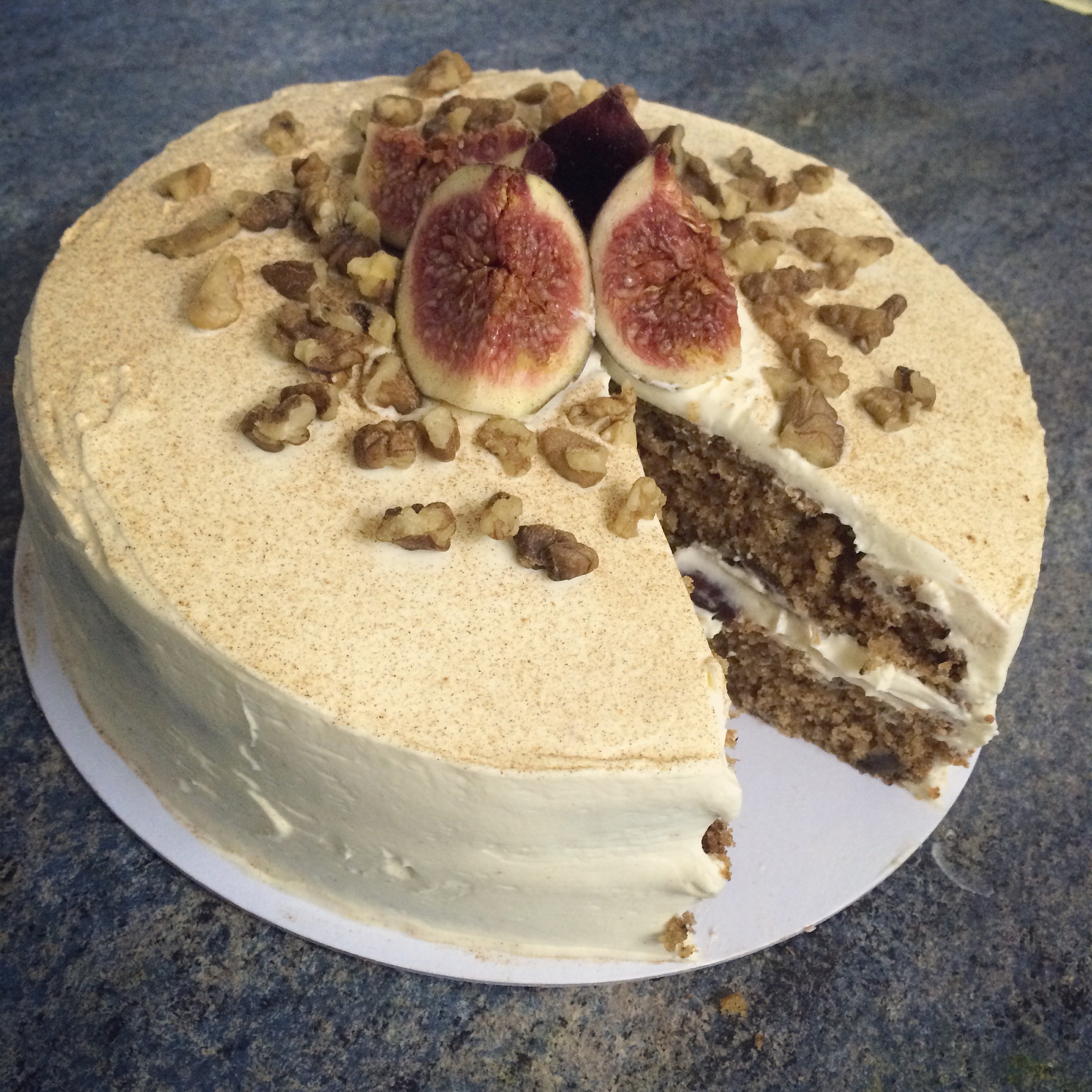 - To assemble, place the first layer of the cake on a cake board – top with around a quarter of the cream cheese mix, spreading evenly with a plastic spatula. Add the jam, spread and then carefully place the the second layer of the cake on top. Cover cake with frosting on top and round the sides, evening it out with a palette knife. To decorate, cut a fig into quarters and place in the center. Sprinkle on walnuts and dust with cinnamon.