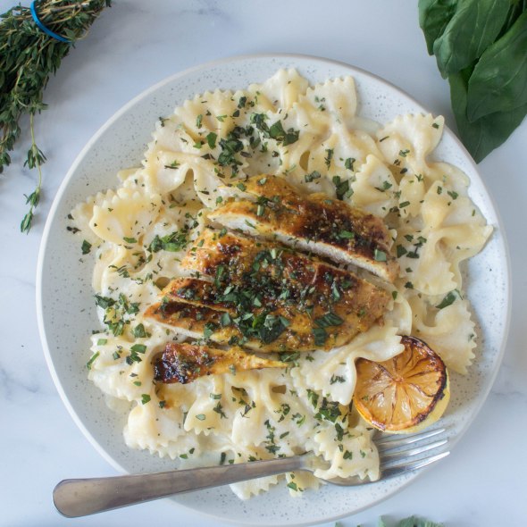 Creamy, Herby Lemon Pasta With Honey Mustard Glazed Chicken