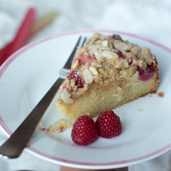 Rhubarb, Raspberry and Almond Crumble Cake