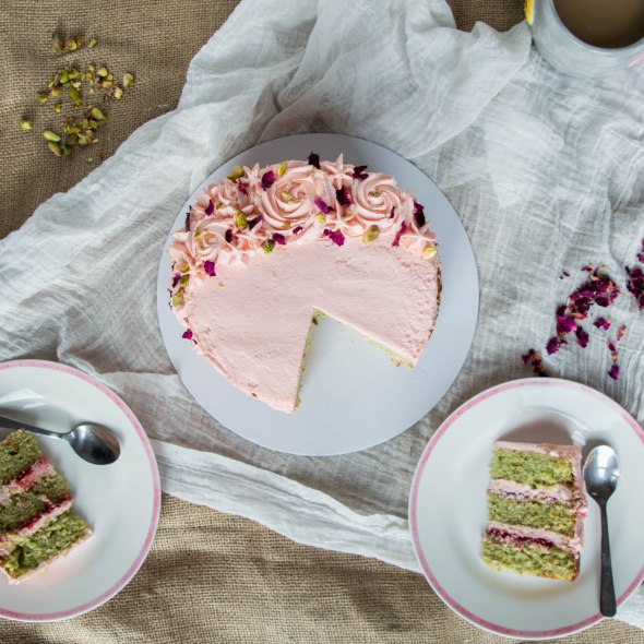 Pistachio, Rose & Cardamom Cake With Raspberry Rose Jam